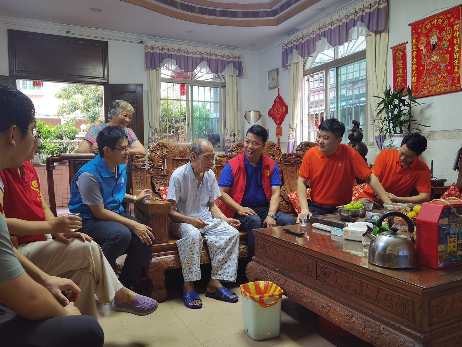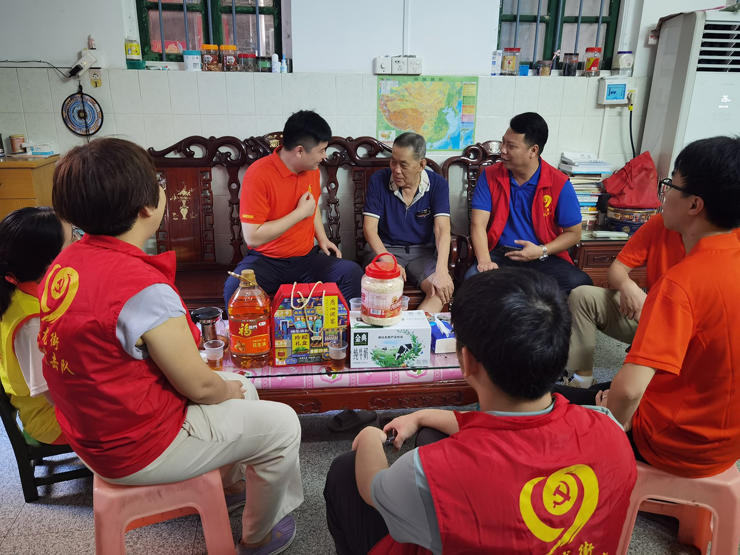 6月20日下午,活動(dòng)統(tǒng)籌人周雁玲、黨員蘇澤彬、黃旭、周超與沙涌村黨支部成員、大龍街社工站成員,一同深入大龍街沙涌村入戶探訪老黨員,向他們致以端午節(jié)日的問候并送上生活用品一批。