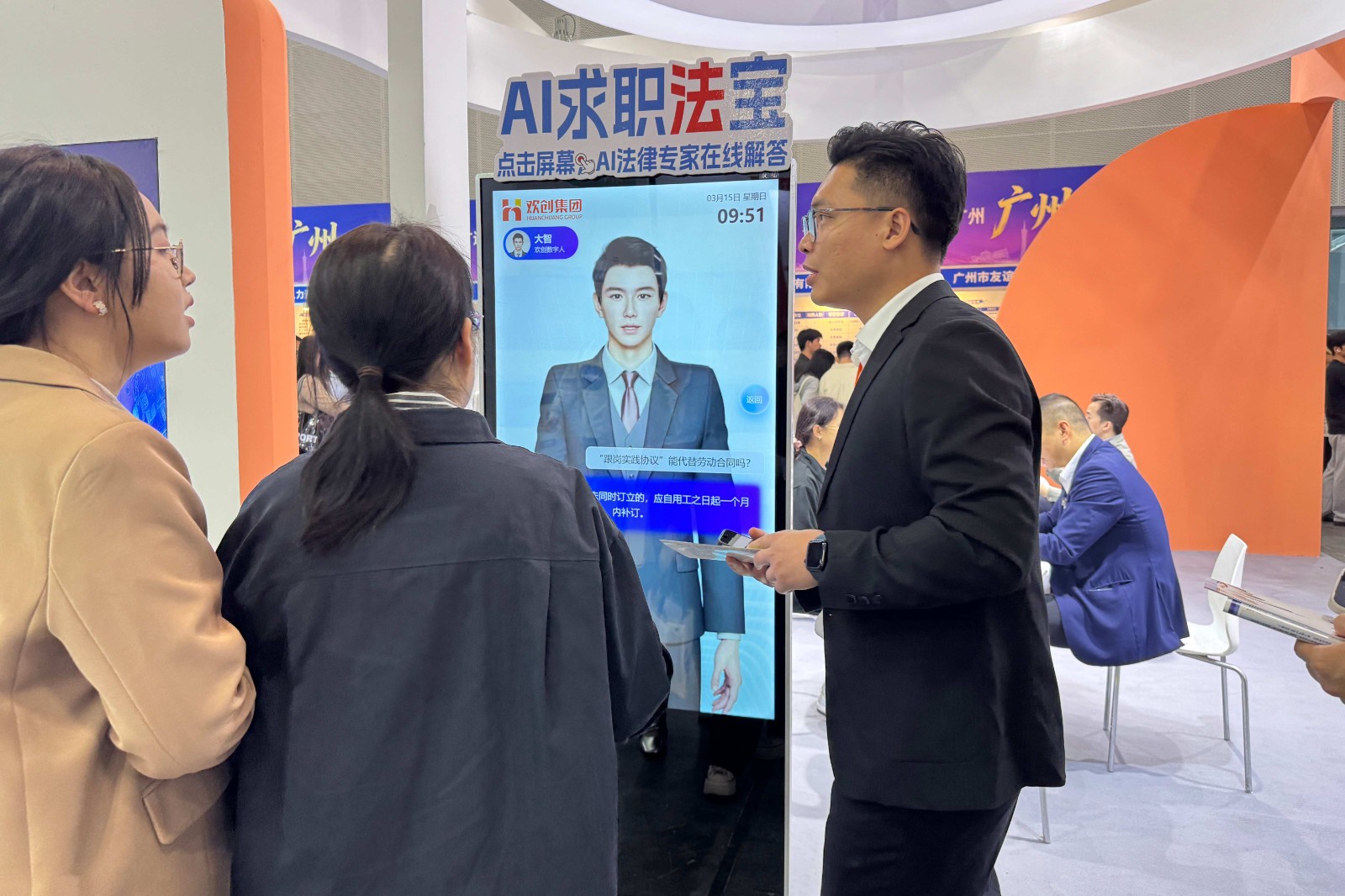 在人氣火爆的17.1館,歡創(chuàng)招聘展區(qū)成為場內(nèi)亮點(diǎn),現(xiàn)場人潮涌動。緊扣本屆招聘會“AI賦能”主題,歡創(chuàng)集團(tuán)展示一系列AI數(shù)字化平臺,以科技驅(qū)動人才服務(wù)升級。